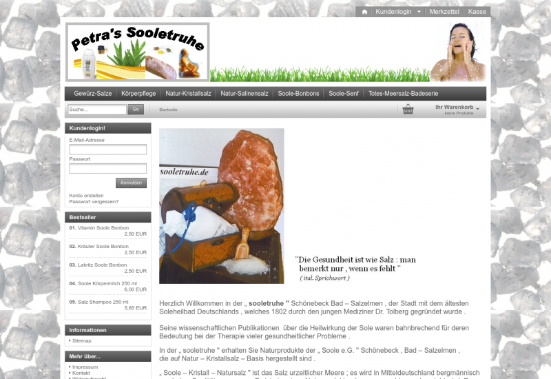 In der „ sooletruhe \'\' erhalten Sie Naturprodukte der „ Soole e.G. \'\' Schönebeck , Bad – Salzelmen , die auf Natur – Kristallsalz – Basis hergestellt sind . „ Soole – Kristall – Natursalz \'\' ist das Salz urzeitlicher Meere ; es wird in Mitteldeutschland bergmännisch von hoher Qualität gewonnen . Es ist ein reines Naturprodukt , das nur gemahlen und gesiebt wird. Es enthält alle wertvollen Mineralien des Urmeeres in ausgewogener Form , und ist frei von Zusatzstoffen jeglicher Art.