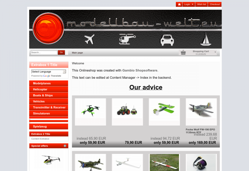 Auf der Suche nach Modellbauartikeln mit gutem Preis/Leistungsverhältnis, bauen wir unseren Shop www.modellbau-welt.eu ständig weiter aus. Wir versuchen unsere Kunden mit Dauertiefstpreisen, hochwertiger Ware und bestmöglichen Service, noch mehr Freude am Hobby zu schenken.