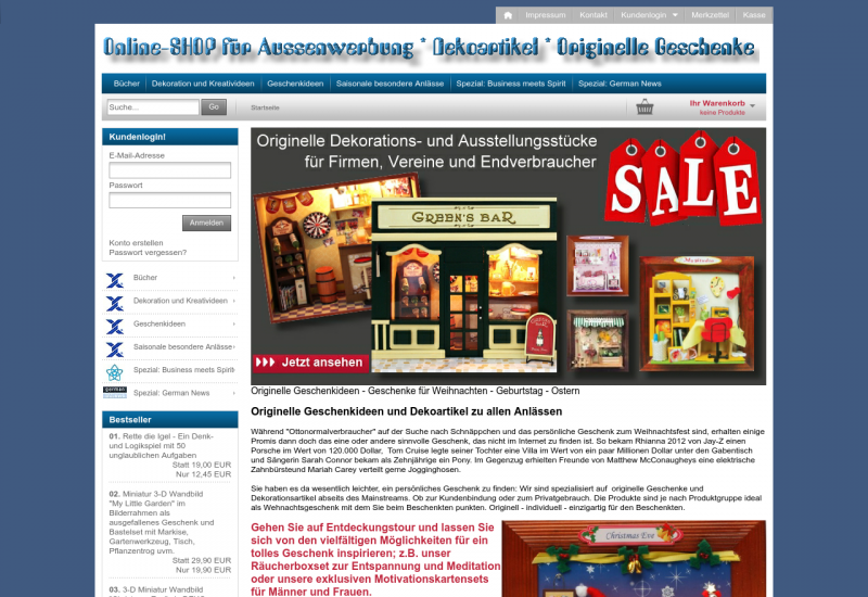 Dieser Shop beinhaltet aussergewöhnliche und originelle Geschenkideen, Dekorationsartikel, Werbepräsente und Aussenwerbemöglichkeiten für Firmen und Endverbraucher. Wir sind spezialisiert auf originelle Werbepräsente, Geschenke, Dekorationsartikel und Advertorials abseits des Mainstreams. Ob zur Kundenbindung, Messeaktivitäten, Aussenwerbung oder zum Privatgebrauch. Die Produkte sind je nach Produktgruppe ein Blickfang für das Schaufenster, Vitrine oder an der Wand bzw. Geschenke und Präsente für Geschäftspartner oder im Privatbereich. Darüber hinaus können sich Geschäftspartner der German News über neue Werbemöglichkeiten informieren um eine erfolgreiche Ausswerbung zu starten.