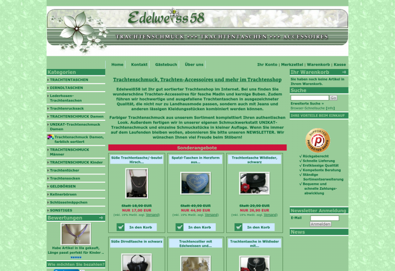 Wir führen wunderschönen Trachten- und Dirndlschmuck in Edelweiß-, Herz- oder Blütenform für Damen, Herren und Kinder. Außerdem zeitlose, aber auch ausgefallene Trachtentaschen in Lederhosen- oder Herzform aus hochwertigem, echten Leder in großer Auswahl.