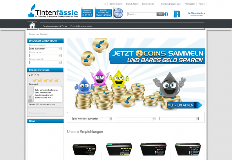 Wir vom Tintenfässle haben uns darauf spezialisiert wie man die monatlichen Ausgaben senken kann. Unser Motto: Sparen Sie am Preis nicht an der Qualität. Daher haben wir kompatible Druckerpatronen die es mit den teuren Originalen ohne Probleme aufnehmen können in Qualität und meist mit höherer Füllmenge. Des weiteren können Sie mit unseren elektrischen Zigaretten im Monat bis zu 200% sparen! Auch eine sehr große Liquid Auswahl von SmokeStar für e-Zigaretten steht Ihnen bei uns zu Verfügung. Der Name SmokeStar steht für geprüfte einwandfrei Qualität.