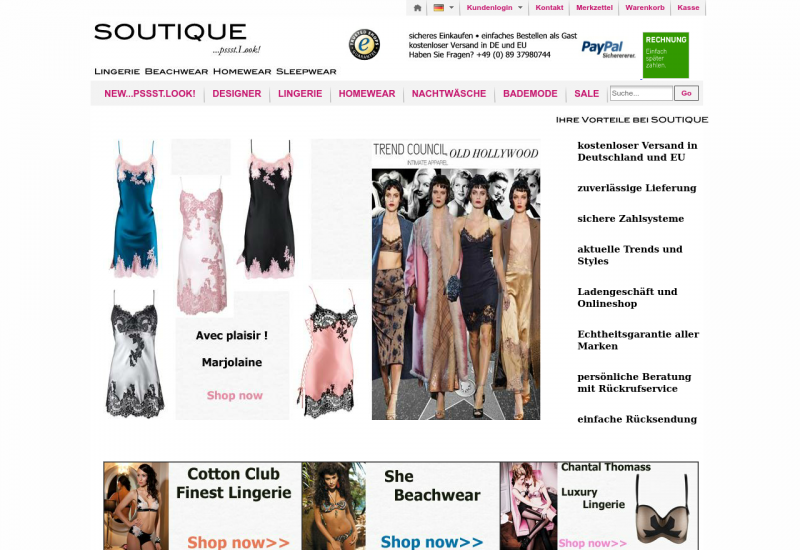 SOUTIQUE ...pssst.Look! exklusive Lingerie, Dessous, Bademode, Nachtwäsche und Homewear. Die neuesten Styles aus den Mode-Metropolen der Welt. Internationale Designer und hochwertige Marken machen das Onlineshopping zum verführerischen Erlebnis.