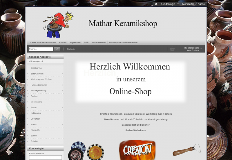 Wir vertreiben Töpferbedarf wie Tonmassen und Glasuren, ausserdem Mosaik und Bastelbedarf.