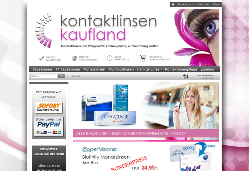 Bei Kontaktlinsen Kaufland erhalten Sie Tageslinsen, Monatslinsen wie auch das passende Pflegemittel. Kaufen Sie bequem und günstig auf Rechnung. In unserem Sortiment finden Sie alle führenden Hersteller Cooper Vision, Ciba Vision, Bausch & Lomb. Alle bekannten Marken wie Biofinity, PureVision und PureVision 2 HD sowie Dailies All Day Comfort, Air Optix Aqua, Air Optix Night und Day Aqua.