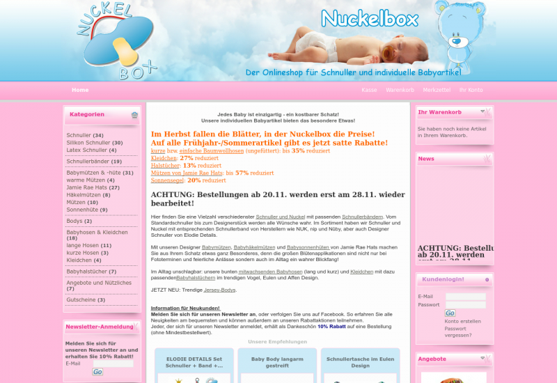 In der Nuckelbox finden Sie eine Vielzahl von Schnullern, von einfach bis zum Designerstück, sowie außergewöhnliche Babymützen,trendige Babyhosen und Kleidchen.