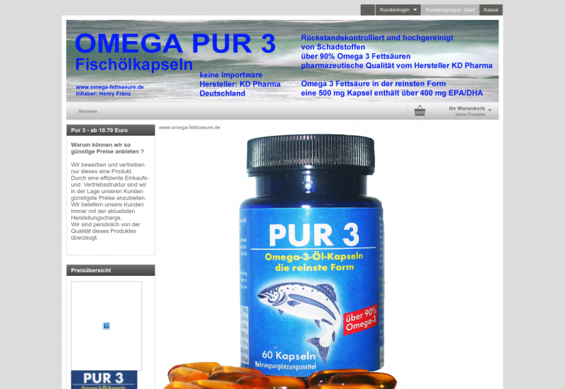 Vertrieb von Omega 3 Fettsäuren in hochkonzentrierter Form. Omega Pur 3 Fischölkapseln enthalten über 90% Omega 3 Fettsäuren. Fazit: Viele Wirkstoffe, wenig unnötige zusätzliche Kalorien.