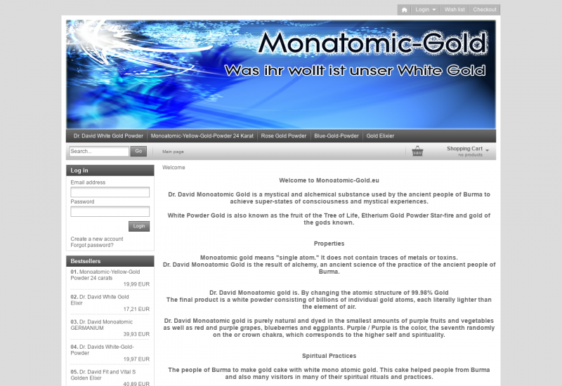 Dr. Davids Monoatomic-Gold ist eine mystische und alchemistischen Substanz, die durch die alten Leute von Burma verwendet werden um Super-Zustände des Bewusstseins und mystische Erfahrungen zu erreichen.