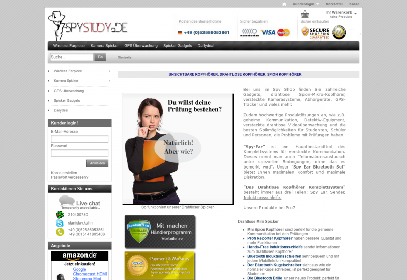 Bei uns im Spy Shop finden Sie zahlreiche Gadgets, drahtlose Spion-Mikro-Kopfhörer, versteckte Kamerasysteme, Abhörgeräte, GPS-Tracker und vieles mehr.