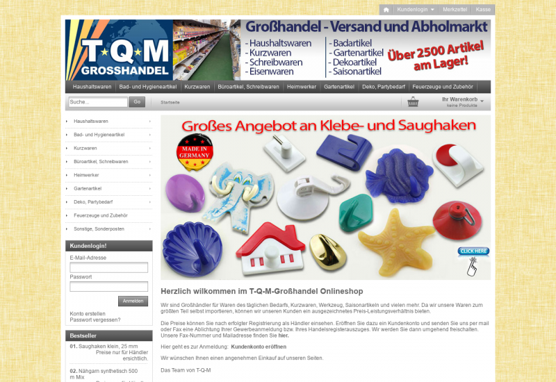 Der Shop richtet sich ausschließlich an Gewerbetreibende. Wir führen ein großes Sortiment an Haushaltswaren, Kurzwaren, Werkzeug und Büroartikel.