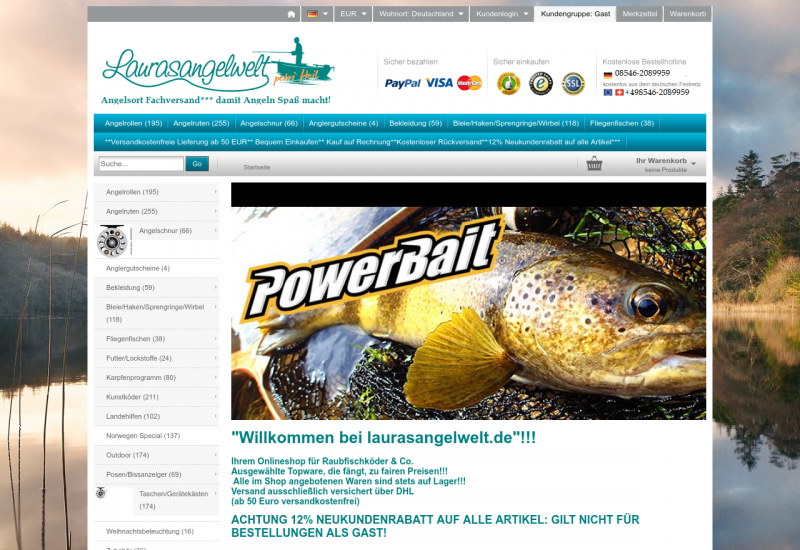 "Angelshop für Angelausrüstung und Angelzubehör - laurasangelwelt.de mit einer großen Auswahl an Angelrollen, Angelruten, Kunstködern und Angelbedarf aller Art. Angelzubehör vom Angler für Angler. Von Angelrute bis Angelrolle, von Angelhaken, Wirbel, monofile Angelschnur und geflochtene Angelschnur für Salz- und Süßwasser über Posen, Bissanzeiger, Angelbekleidung, die ganze Palette von Angelzubehör und Angelbedarf bieten wir in einem einzigen Angelshop. Auf laurasangelwelt.de bleiben keine Wünsche unerfüllt. Unser Angelshop bietet Ihnen alles, was Sie zum Angeln benötigen."