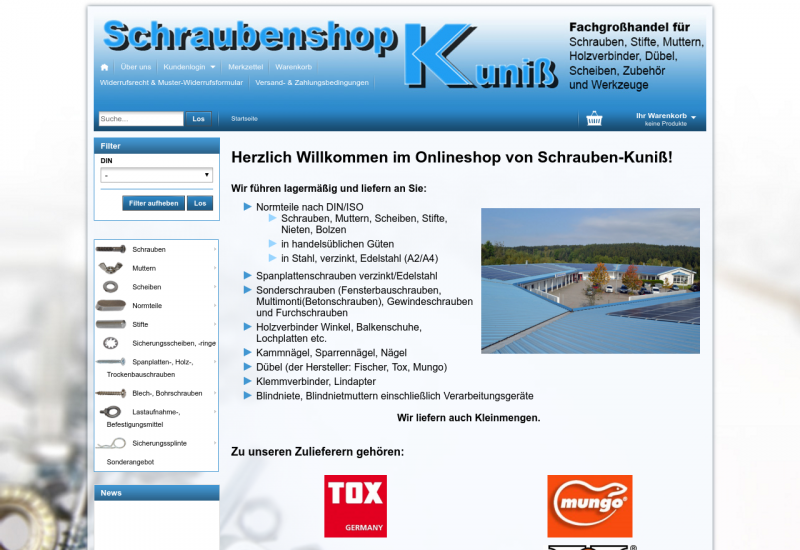 Auf www.Schrauben-Kuniß.de bieten wir Schrauben, Muttern und andere DIN-Teile wie z.B. Sicherungssplinte an. Wir liefern auch Kleinmengen.