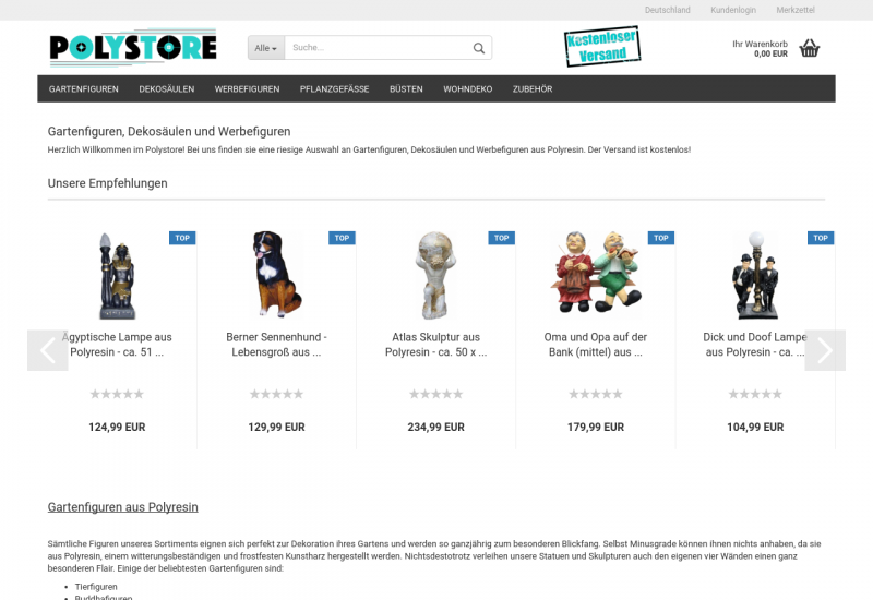 Es werden Gartenfiguren, Dekosäulen und Werbefiguren angeboten.