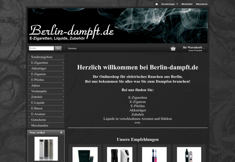 Ihr Onlineshop für elektrisches Rauchen aus Berlin! Bei uns finden Sie aus über 600 Produkten alles was Sie zum Dampfen brauchen! E-Zigaretten, E-Zigarren, E-Pfeifen, Akkuträger, Zubehör und Liquids verschiedener Hersteller!