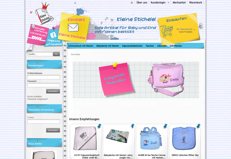 Die Kleine Stichelei bestickt verschiedenste Artikel von Sterntaler, Käthe Kruse ect. mit einem gewünschten Namen. Es gibt Schmusetücher mit Namen, bestickte Babydecken oder Kindergartentaschen mit Namen.