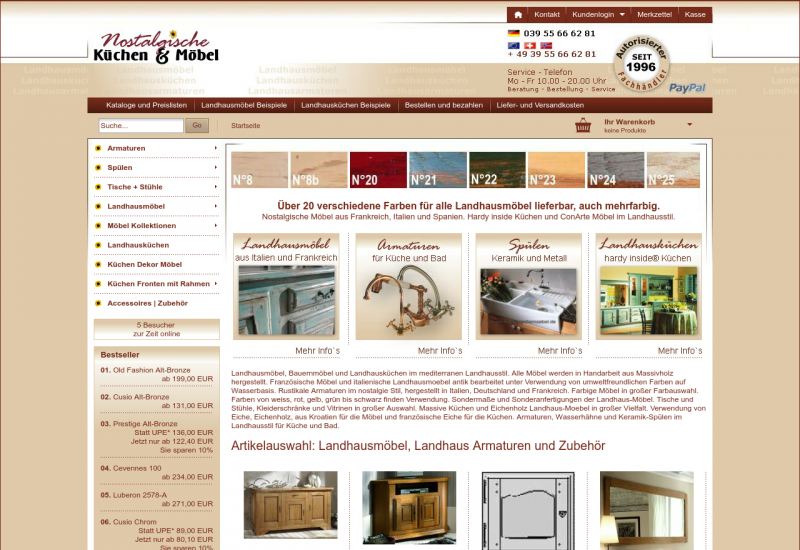 Handgefertigte Vollmassivholz-Möbel, antikbearbeitete Küchen und Möbel, sowie passendes Zubehör wie Keramikspülen und nostalgische Armaturen