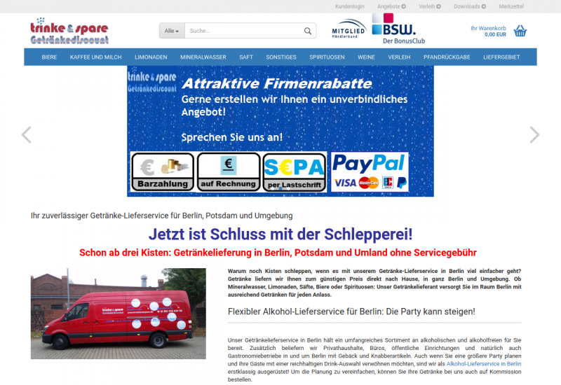 Getränkelieferant in Berlin und Potsdam. Lieferung ab 3. Kisten frei Haus. Bestellungen werden schon am nächsten Werktag ausgeliefert