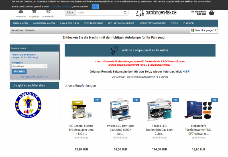 Beleuchtung für Ihr Fahrzeug von namenhaften Herstellern wie General Electric, Philips oder OSRAM bietet Ihnen die nötige Qualität für eine sichere Fahrt. Von der H1 bis zur H11, Fernlicht oder Abblendlicht, Standlicht und Nebellicht, sowie LED-Tagfahrlicht und Xenon-Brenner. Wenn es ums Thema Fahrzeuglampen geht, sind Sie bei uns an der richtigen Adresse.