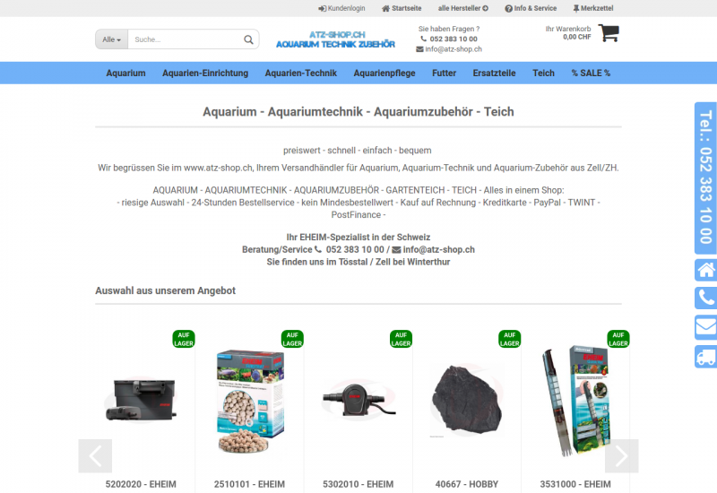 ATZ-SHOP.CH - Ihrem Versandhändler für Aquarium, Technik und Zubehör, alles für eine erfolgreiche Aquaristik. Sie finden hier im Shop eine grosse Auswahl professioneller Artikel rund um die Süss- und Meerwasseraquaristik und Gartenteich. Wir bieten verschiedene Produkte für das Aquarium, Technik und Zubehör von Amazonas, Arcadia, Aquatic Nature, ARKA, Microbe-Lift, Back to Nature, Dennerle, EHEIM, Fauna Marin, Femanga, Giesemann, HOBBY, Juwel, NEWA, sera, Tetra, Tunze uvm...