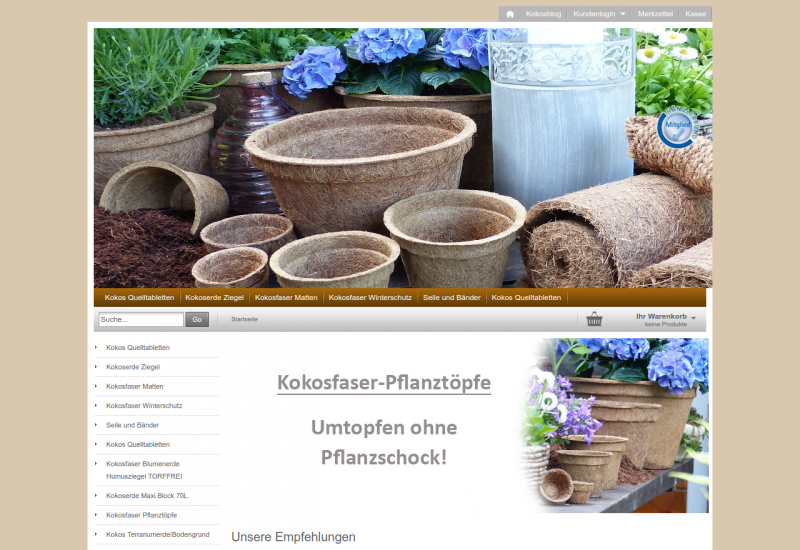 kokos-erde.de steht für organische und umweltverträgliche Produkte aus natürlichen Kokosfasern, Jute und Hanf für den Garten- und den Heimtierbereich. Gartenfreunde finden von Anzucht- und Pflanztöpfen über 100% torffreie Kokoserde bis hin zu Winterschutzmatten, Bindesortiment und Mulchscheiben alles fürs "Natürliche Gärtnern". Humusziegel, ungedüngter grabfähiger Bodengrund, Kokosfaser Rückwände als Module, Reptilien- und Fischhöhlen sowie Nahrungsergänzungsmittel sind beliebt bei Terrarium- und Aquariumbesitzern. Alle Kokosfaserprodukte sind torffrei, umweltfreundlich, biologisch abbaubar, zu 100% aus nachwachsenden Rohstoffen, frei von Schadstoffen, Unkraut und mineralischem Dünger.