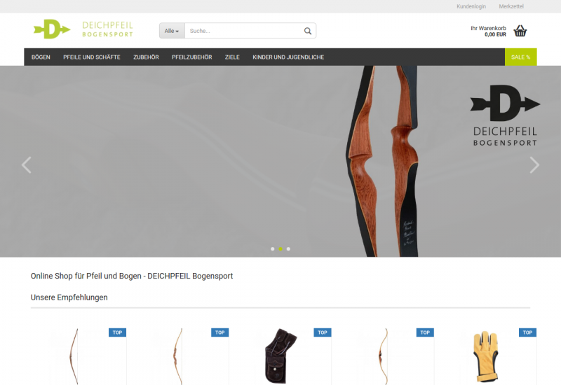 Über 500 traditionelle Bogensportartikel. Ständig über 200 Bögen lagernd. Versandkostenfrei ab 150 €. Kauf auf Rechnung. Schneller Versand! Der DEICHPFEIL Online Store ist die erste Adresse, wenn es um traditionelle Bogensportartikel geht! Hier können Sie sicher und bequem Ihre Bogensport Ausrüstung kaufen und sich dabei von uns beraten lassen. Egal ob Sie Bogenschiessen als Einsteiger oder geübter Schütze betreiben, wir führen die richtigen Bögen, Ausrüstung und Zubehör für Ihr Abenteuer mit Pfeil und Bogen. Im DEICHPFEIL OnlineShop sowie in unserem Ladengeschäft finden Sie eine große Auswahl an Recurvebögen, Hybridbögen, Langbögen, Carbonpfeile und Carbonschäfte, Lederartikel und Zubehör