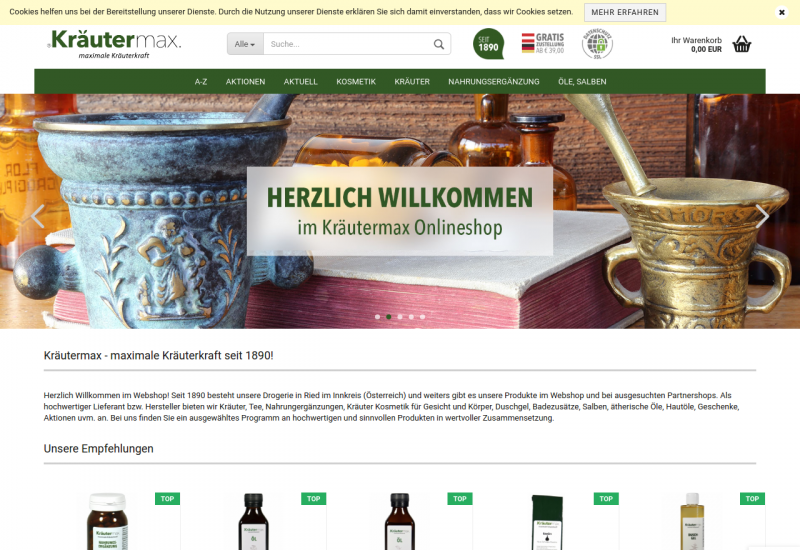 Seit 1890 besteht unsere Drogerie in Ried im Innkreis (Österreich) und weiters gibt es unsere Produkte im Webshop und bei ausgesuchten Partnershops. Als hochwertiger Lieferant bzw. Hersteller bieten wir Kräuter, Tee, Nahrungergänzungen, Kräuter Kosmetik für Gesicht und Körper, Duschgel, Badezusätze, Salben, ätherische Öle, Hautöle, Geschenke, Aktionen uvm. an. Bei uns finden Sie ein ausgewähltes Programm an hochwertigen und sinnvollen Produkten in wertvoller Zusammensetzung.