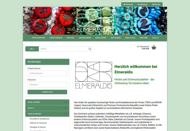 Elmeraldis bietet eine breite Auswahl an hochwertige Perlen der Firmen TOHO und MIYUKI, Swarovski und Preciosa sowie Polaris Perlen und viele böhmische Glasperlen. Das Warenangebot umfasst außerdem viele Metallperlen und Charms sowie Schmuckzubehör aus 925er Silber, Zamak und Edelstahl, Edelsteinperlen, hochwertige Lederbänder, Fireline, Wildfire, S-LON Nylongarn, Kautschukband und Nymo Garn sowie Klebstoffe, englische Perlennadeln und vieles mehr für kreative Hobbies und Handarbeiten.