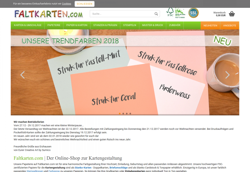 Unsere Papeterie auf Faltkarten.com ist für eine harmonische Farbgestaltung Ihrer Hochzeit, Einladung, Geburtstag und allen passenden Anlässen abgestimmt. Unsere hochwertigen FSC-zertifizierten Papiere für die Kartengestaltung sind als blanko-Karten - Doppelkarten, Briefumschläge und als blanko Cardstock & Tonpapier erhältlich. Einzigartig in Europa, ist unser farblich passendes Stempelkissen und Farbspray zu unseren Papieren. So können Sie Ihre Grußkarten oder Einladungskarten ganz individuell Ton in Ton gestalten.