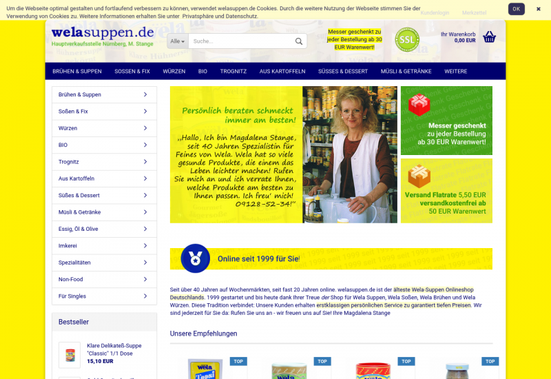 Online-Shop der Wela Hauptverkaufsstelle Nuernberg, Magdalena Stange. Im Angebot sind neben den Suppen, Soßen, Brühen und Würzen von Wela auch Feinkost anderer Hersteller