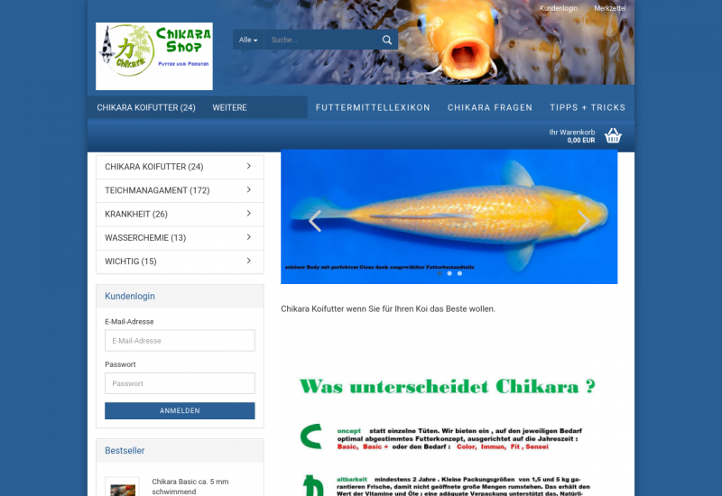 Vertrieb von selbst entwickeltem Koifutter und Teichzubehör