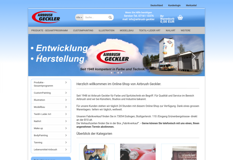 Ein Online-Shop, der Qualitätsprodukte für den Bereich Airbrush anbietet. Dies eines Teils für Künstler in den Bereichen BodyPainting, Airbrush-Tattoo, Illistration, Modellbau, Textildesign, Lederdesign, CustumPainting und allen sonst noch vorstellbaren Hobbybereichen. Weiterhin bietet dieser Shop für den gewerblichen Einsatz Produkte für die Bereiche: Industrie, Handwerk, Entwicklung, wie z.B. Fingernagelstudios, Kosmetikerinnen, Visagisten, Beautysalons, Konditoren, 3D-Scanning, Fensterhersteller, Fahrzeuglackierer, Spot-Repair, Werbedesigner, Automobilindustrie, Prüflabore, Fernsehstudios und viele andere Berufszweige, bei denen Materialien sehr fein zerstäubt auf alle möglichen Untergründe aufgetragen werden. Bei den angebotenen Produkte der eingetragenen Europamarke TOPAIR handelt es sich um Entwicklungen aus dem Hause Airbrush Geckler, die überwiegend in Baden-Württemberg hergestellt werden.