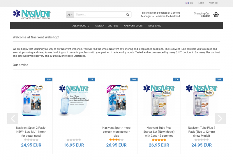 Unser Nasivent Shop ist ein Online Shop für Produkte zur Atmungsverbesserung und gegen Schnarchen. Nasivent Produkte werden auch zur Leistungsverbesserung beim Sport eingesetzt. Nasivent Anti Schnarch Mittel gibt es seit 2008 und Nasivent wird von vielen HNO-Ärzten und Kliniken in Deutschland, Österreich und der Schweiz, sowie vielen anderen Ländern empfohlen und eingesetzt.