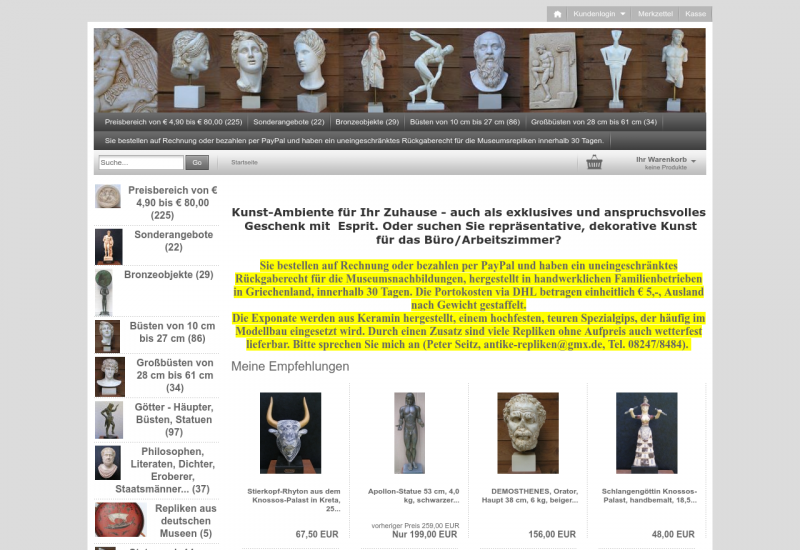 Repliken von Kunstwerken aus dem griechischen Altertum. Beispielsweise Büsten von Alexander dem Großen, Aristoteles, Platon, Sokrates, Pythagoras, Cicero, Plutarch, Demokrit, Demosthenes, Aischylos, Sophokles, Solon; verschiedener Götter wie Zeus, Artemis, Hygieia, Hera, Apollon, Hermes, Eros, Aphrodite, Athena, Herakles, Satyre u.a. Derzeit rund 350 Exponate, aufgeteilt in Fresken, Reliefs, Statuen, Tanagras, Büsten. Dieser Webshop ist in seiner Art einzigartig.