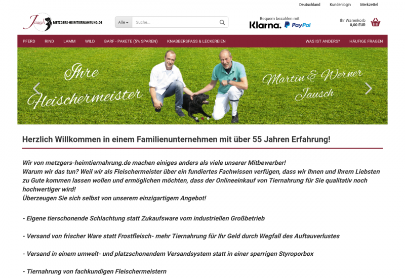 In unserem Onlineshop bieten wir, die Fleischermeister Werner& Martin Jausch, Ihnen qualitativ hochwertige BARF- Produkte aus eigener Schlachtung und Herstellung an. Wir verzichten auf sperrige Styroporbox und übersenden Ihnen unsere Produkte in einem innovativen Kühlsystem, so dass die Waren stets in einem einwandfreien Zustand bei Ihnen ankommen.