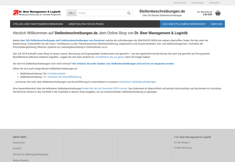 Stellenbeschreibungen.de ist Deutschlands größter Online Shop für Muster-Stellenbeschreibungen zum Sofort-Download. Neben fast 600 Stellenbeschreibungen und Funktionsbeschreibungen, welche die Anforderungen der DIN/EN/ISO 9000x bei weitem übertreffen, finden Sie hier unter der Bezeichnung "Arbeitshilfen für die Praxis" Fachliteratur zu den Themenbereichen Mitarbeiterführung, Organisation und Zusammenarbeit, Zeit- und Selbstmanagement, Techniken der Entscheidungsfindung, Rhetorik, Systeme zur Leistungsbeurteilung in Unternehmen u.a.m.