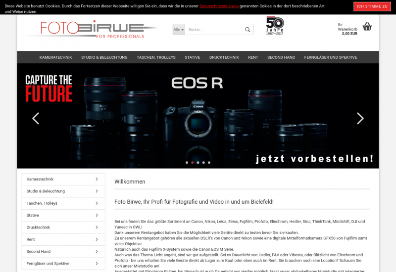 Foto Birwe, Ihr Profi für Fotografie und Video in und um Bielefeld! Bei uns finden Sie das größte Sortiment an Canon, Nikon, Leica, Zeiss, Fujifilm, Elinchrom, Hedler, Sirui, ThinkTank, Mindshift, Yuneec in OWL! Dank unserem Rentangebot haben Sie die Möglichkeit viele Geräte direkt zu testen bevor Sie sie kaufen. Zu unserem Rentangebot gehören alle aktuellen DSLR's von Canon und Nikon sowie eine digitale Mittelformatkamera GFX50 von Fujifilm samt vieler Objektive. Auch was das Thema Licht angeht, sind wir gut aufgestellt. Sei es Dauerlicht von Hedler, F&V oder Vibesta, oder Blitzlicht von Elinchrom oder Profoto - bei uns erhalten Sie viele Geräte direkt ab Lager zum Kauf oder eben auch im Rent. Sie brauchen noch eine Location? Schauen Sie sich unser Mietstudio an! Ausgestattet mit Elinchrom Blitzen, bei Wunsch auch Dauerlicht von Hedler möglich, lässt unser abdunkelbares Mietstudio kaum Wünsche offen!