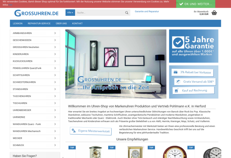 Grosses Uhren Angebot an hochwertigen Zeitmessern unterschiedlichster Stilrichtungen von Barock über Rock bis Pop. Klassische Standuhren, exklusive Tischuhren, maritime Schiffsuhren, avantgardistische Pendeluhren und moderne Wanduhren, angetrieben in traditioneller Mechanik oder Quarz –Elektronik. Auch Wecker ohne Tick-Geräusch und ständiger Nachtbeleuchtung sowie Armbanduhren, Taschenuhren und Kinderuhren erfreuen sich als Präsente großer Beliebtheit u.a.von AMS, Hermle, Kieninger, Mayr, Schatz, und Vuillemin.