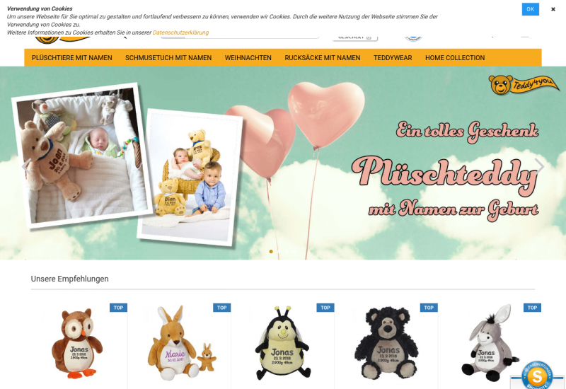 Teddy4you - Plüschtiere mit Namen. Bei Teddy4you bekommen Sie Plüschtiere, Schmusetücher und Dinorucksäcke individualisiert mit Namen. Seit 2012 besticken wir schon Stofftiere mit Namen und liefern Sie in die ganze Welt. Große Auswahl an Plüschtieren - Wir haben eine große Auswahl an Plüschtieren und Schmusetüchern. Da sollte jeder sein Lieblingstier finden. Vom klassischen Teddybären, unserem Bestseller Teddy Zippie, über Eulen, Giraffen, Kängurus, Hunde und Dinoraurier. Unsere Auswahl ist groß.