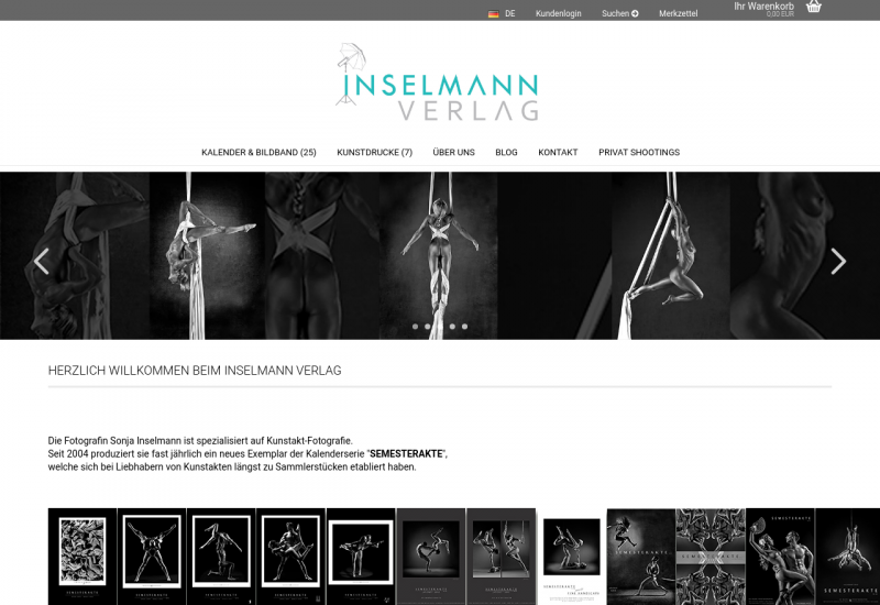 Die Fotografin Sonja Inselmann ist spezialisiert auf Kunstakt-Fotografie. Seit 2004 produziert sie fast jährlich ein neues Exemplar der Kalenderserie "SEMESTERAKTE", welche sich bei Liebhabern von Kunstakten längst zu Sammlerstücken etabliert haben. Erweitert hat sie ihr Programm mit zahlreichen weiteren Druckerzeugnissen.