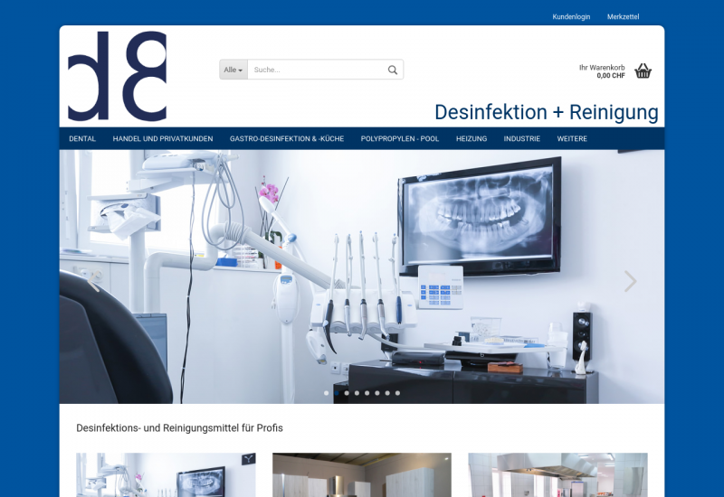 Unser Shop ist spezialisiert auf den Vertrieb von professionelle Nischenprodukten im den Bereichen Reinigung und Desinfektion. Die Produkte sind einsetzbar in verschiedenste Sparten. Dental, Gastro, Industrie, Klimatechnik. Diese Produkte sind aber auch in Haushaltsgrössen für den Privatbereich zugänglich.