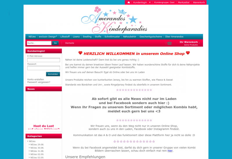 Amerandos Kinderparadies ? dein Paradies für Stoffe ? . Nähen ist deine Leidenschaft? Dann bist du bei uns genau richtig :) Bei uns kannst du deinen kreativen Ideen freien Lauf lassen. Wir haben wunderschöne Stoffe für dich & deine Nähprojekte und helfen immer gern bei der Auswahl geeigneter Kombistoffe. Unsere Produkte reichen von kunterbunten Jersey, bis hin zu warmen Stoffen, wie Fleece & Sweat. Standards wie Bündchen und Uni-, sowie Ringeljersey findest du ebenfalls in unserem Sortiment. Wir freuen uns auf deinen Besuch <3