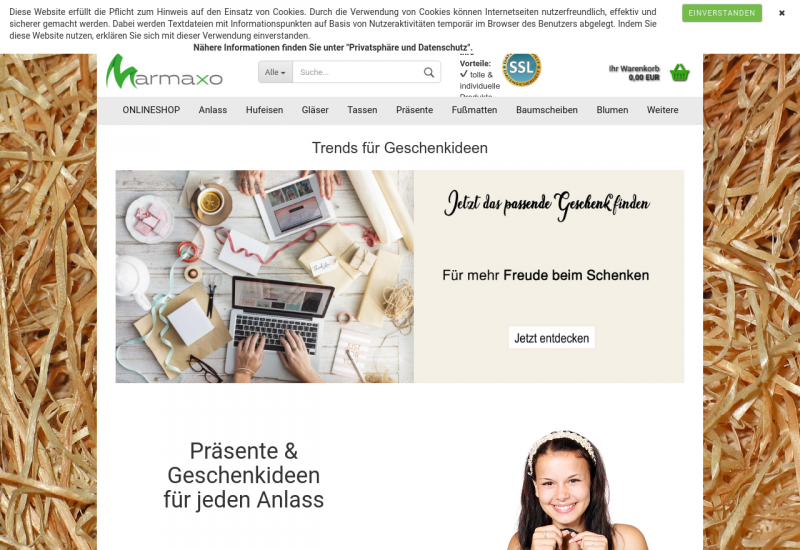 Marmaxo.de bietet verschiedene Geschenkartikel für jeden Anlass an. Viele der Artikel können individuell personalisiert werden. Beispielsweise kann für ein Richtfest ein original getragenes Hufeisen nach den Wünschen der Kunden graviert werden. Desweiteren bieten wir klassische Geschenke an, von der Kaffeetasse bis hin zum Blumenstrauß to-go. Alle Geschenkartikel sind außergewöhnlich und hochwertig.
