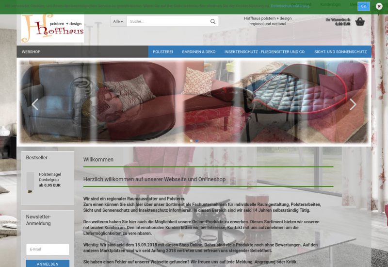 Wir vertreiben Online Polsterknöpfe und Zubehör für Gardinen, Polsterarbeiten und vieles mehr. Des weiteren dient der Shop auch als Webseite für unsere Präsentation der regionalen Produkte. Als Raumausstatter und Polsterer (Kerngeschäft) ist Gambio für uns die beste Lösung.