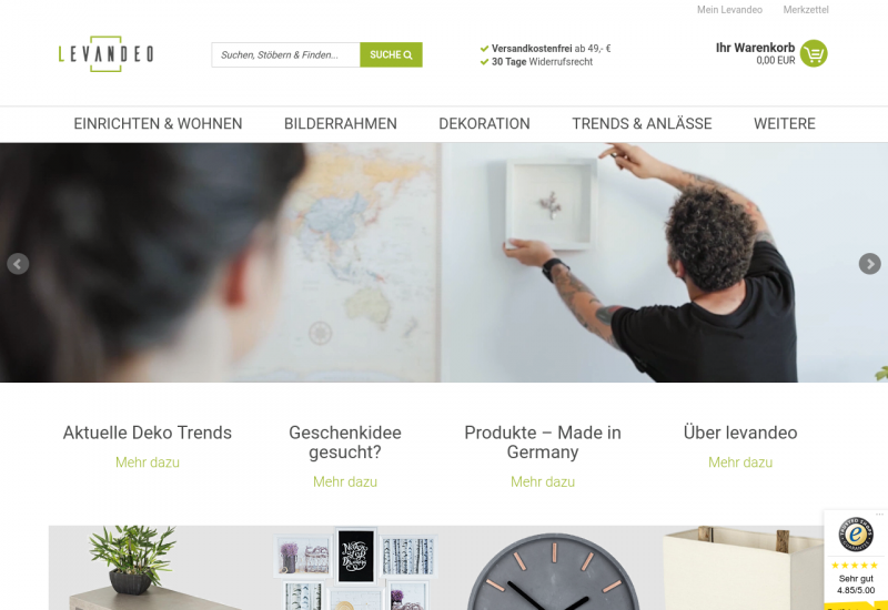 levandeo - style your home - style your life Als wir unsere Marke levandeo gegründet haben, war es unser Ziel dem anspruchsvollen Kunden ein Produktsortiment zu präsentieren, welches seinem Anspruch entspricht und dazu auch preislich erschwinglich ist. Diesem Ziel sind wir bis heute treu geblieben und investieren uns mit Leidenschaft und Elan laufend neue, wertige Produkte preisgünstig zu präsentieren. Unsere Produkte: Sie finden bei uns Möbel und Dekorationen rund um das Thema Haus und Garten. Viele unserer Produkte werden direkt in Deutschland oder in der EU produziert. Wir achten bei der Herstellung unserer Markenprodukte vor allem auf faire Arbeitsbedingungen, sowie nachhaltige und zertifizierte Rohstoffe! Unser Hauptsegment sind Bilderrahmen in vielen Formen und Farben. Besonders beliebt sind unsere Bilderrahmen Collagen, hier kann unser Kunde gleich mehrere schöne Erinnerungen gekonnt in Szene setzen. Bei uns ist wirklich für jeden Geschmack und jeden Einrichtungsstil das richtige dabei. Natürlich achten wir bei unseren Produkten auch immer auf die aktuellen Einrichtungstrends, ob Shabby Chic, Maritim oder der stylische Industrial-Look, schauen Sie doch gleich mal in unsere Dekoideen rein.