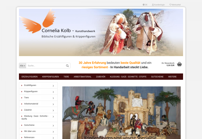 Kunsthandwerkliches Erzeugnis von Biblischen Erzählfiguren und handgemachten Krippenfiguren. Sie erhalten alles rund um die beliebten Figuren vom Arbeitsmaterial über Zubehör, Tiere, Stoffe, Kulissen bis hin zu fertigen KOLB-Erzählfiguren.