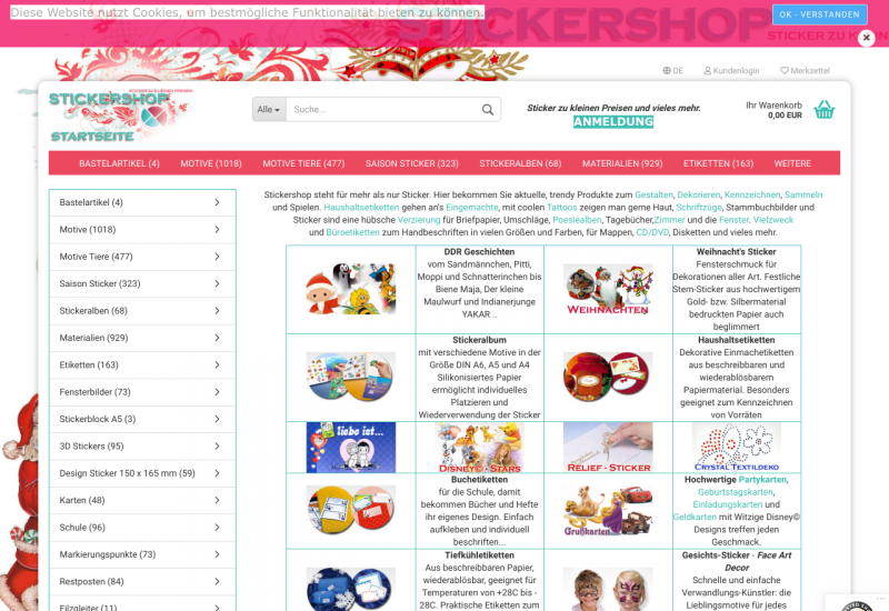 Stickershop steht für mehr als nur Sticker. Hier bekommen Sie aktuelle, trendy Produkte zum Gestalten, Dekorieren, Kennzeichnen, Sammeln und Spielen. Haushaltsetiketten gehen an's Eingemachte, mit coolen Tattoos zeigen man gerne Haut, Schriftzüge, Stammbuchbilder und Sticker sind eine hübsche Verzierung für Briefpapier, Umschläge, Poesiealben, Tagebücher,Zimmer und die Fenster. Vielzweck und Büroetiketten zum Handbeschriften in vielen Größen und Farben, für Mappen, CD/DVD, Disketten und vieles mehr.