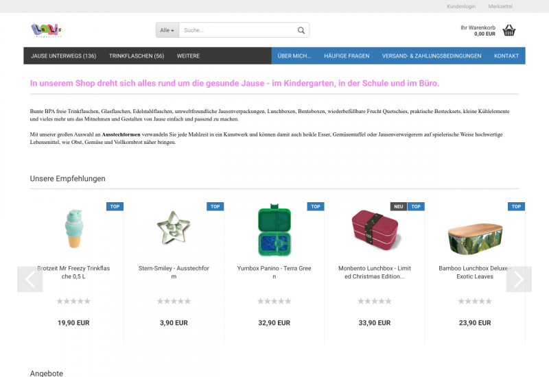 In unserem Shop dreht sich alles rund um die gesunde Jause (Brotzeit) - im Kindergarten, in der Schule und im Büro. Bunte BPA freie Trinkflaschen, Glasflaschen, Edelstahlflaschen, umweltfreundliche Jausenverpackungen, Lunchboxen, Bentoboxen, wiederbefüllbare Frucht Quetschies, praktische Bestecksets, kleine Kühlelemente und vieles mehr um das Mitnehmen und Gestalten von Jause einfach und passend zu machen. Mit unserer großen Auswahl an Ausstechformen verwandeln Sie jede Mahlzeit in ein Kunstwerk und können damit auch heikle Esser, Gemüsemuffel oder Jausenverweigerern auf spielerische Weise hochwertige Lebensmittel, wie Obst, Gemüse und Vollkornbrot näher bringen.