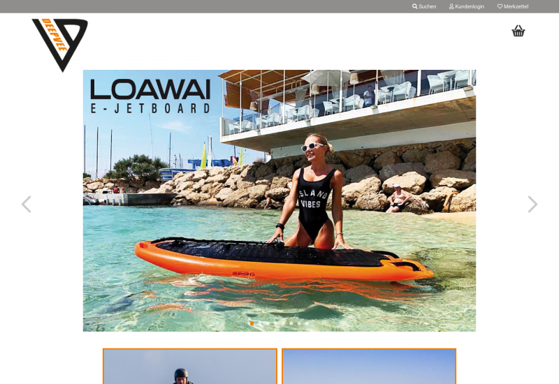 DeepVee - Ihr Marktplatz für Außergewöhnliches im, am, unter und auf dem Wasser. Bei DeepVee finden Sie einzigartige Produkte, die Ihnen in Ihrer Freizeit mehr Freude bereiten. Cruisen Sie mit dem E-Skateboard die Strandpromenade entlang, tauchen Sie mit dem Seabob ab in die bunte Unterwasserwelt, erleben Sie den Rausch der Geschwindigkeit mit den E-Surfboards von Lampuga oder Awake oder entdecken Sie die Umgebung mit dem E-Scooter von SoFlow.
