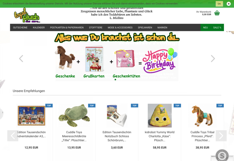Auf Loyal-Plush.de findest Du eine tolle, qualitativ hochwertige Auswahl an Stofftieren, Lizenzartikeln, Motivkarten und vieles mehr.