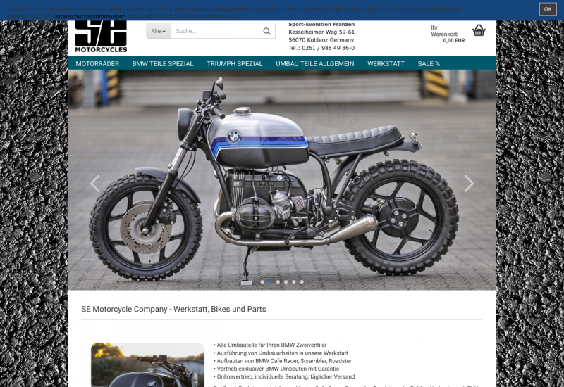 SE Werkstatt, Bikes und Parts • Alle Umbauteile für Ihren BMW Zweiventiler • Ausführung von Umbauarbeiten in unsere Werkstatt • Aufbauten von BMW Café Racer, Scrambler, Roadster • Vertrieb exklusiver BMW Umbauten mit Garantie • Onlinevertrieb, individuelle Beratung, täglicher Versand Bei Sport-Evolution entstehen exklusive Cafe Racer, Scrambler, Roadster oder Bobber Umbauten mit TÜV und Garantie. SE ist aber nicht nur Fahrzeughersteller, wir entwickeln, konstruieren und produzieren viele der verwendeten Teile selbst. Unsere erfahrenes Team kennt jedes Details der BMW Zweiventiler, egal ob es um den Motor, das Fahrwerk, die Elektrik oder den Rahmenaufbau geht. Lassen Sie uns also Ihr Umbauprojekt begleiten. Wir wählen gemeinsam mit Ihnen die Teile aus und unterstützen Sie bei der Realisierung.