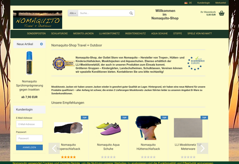 Nomaquito-Shop, der Outlet Store von Nomaquito – Hersteller von Tropen-, Hütten- und Kinderschlafsäcken, Moskitojacken und Aquaschuhen. Ebenso erhältlich der LLI-Moskitonetztüll, der auch in unseren Produkten zum Einsatz kommt.